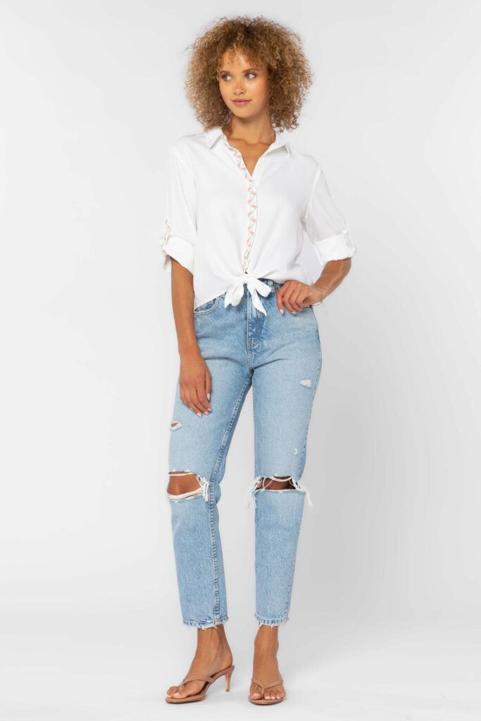 A lightweight and soft button-up shirt made from Tencel?. This long sleeve shirt features basic collar, v-neckline, button-up at front, covered placket, roll-tab sleeves, back pleat panel, front waist tie at hem, and slightly crop fit.